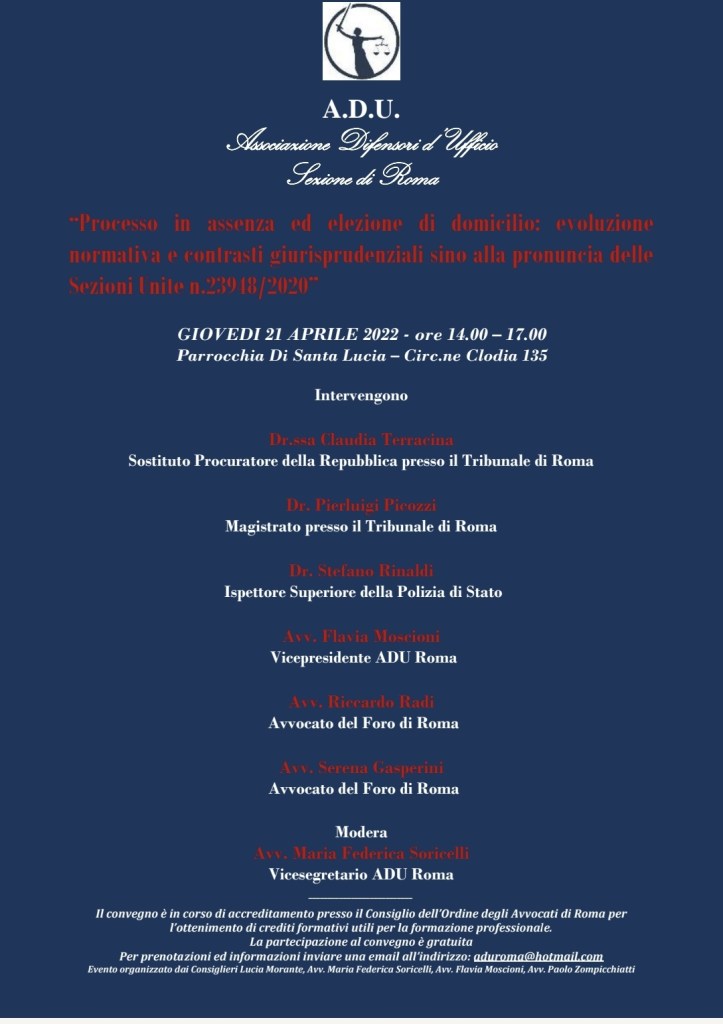 L’Associazione Difensori d’Ufficio di Roma – ADU Roma, ha organizzato un Convegno al titolo: