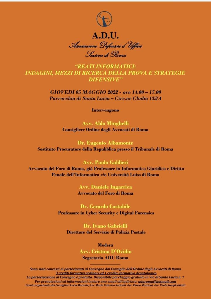 Relatori : Avv. Aldo Minghelli (Consigliere Ordine degli Avvocati di Roma); Dr. Eugenio Albamonte; (Sostituto Procuratore della Repubblica presso il Tribunale di Roma); Avv. Paolo Galdieri (Avvocato del Foro di Roma e Professore in Informatica Giuridica e Diritto Penale dell’Informatica c/o Università Luiss di Roma); Avv. Daniele Ingarrica (Avvocato del Foro di Roma); Dr. Gerardo Costabile (Professore in Cyber Security e Digital Forensics); Dr. Ivano Gabrielli (Direttore del Servizio di Polizia Postale); modera Avv. Cristina D’Ovidio (Segretario ADU Roma)