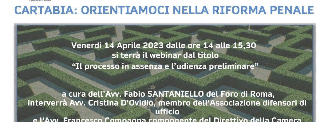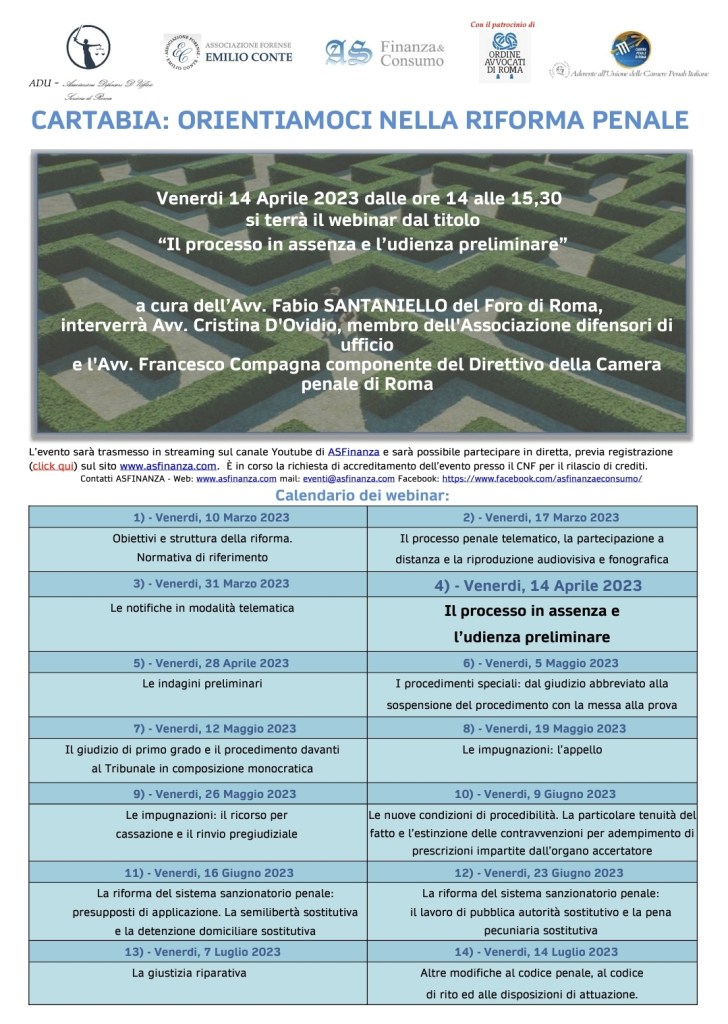 L’associazione ADU – Associazione Difensori d’Ufficio di Roma, in collaborazione con Camera Penale di Roma, AFEC – Associazione Forense Emilio Conte, e l’Associazione ASFINANZA&CONSUMO, promuove un ciclo di 14 incontri, che si terranno il venerdì dal 10 marzo al 14 luglio 2023, trasmessi come webinar ed in streaming sulla piattaforma di ASFINANZA.