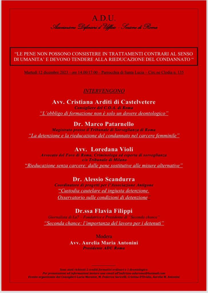 L’Associazione Difensori d’Ufficio di Roma – ADU Roma ha organizzato un Convegno dal titolo: “Le pene non possono consistere in trattamenti contrati al senso di umanità e devono tendere alla rieducazione del condannato” .