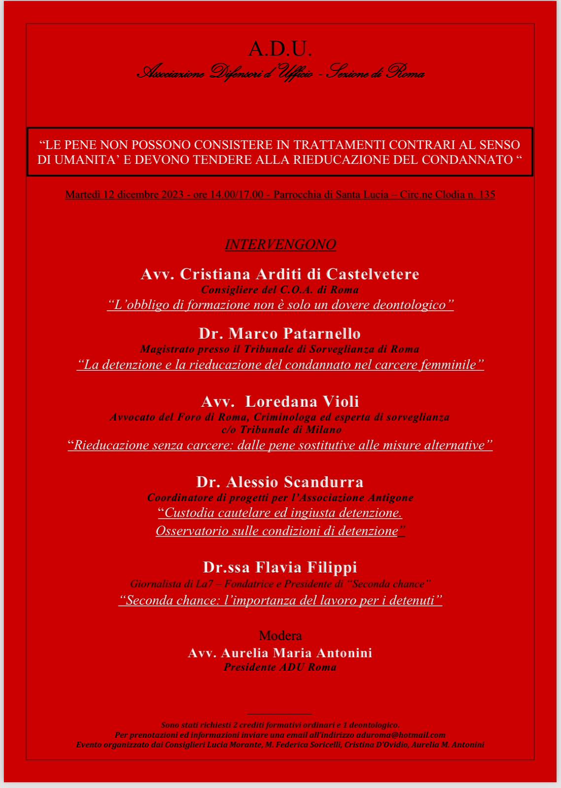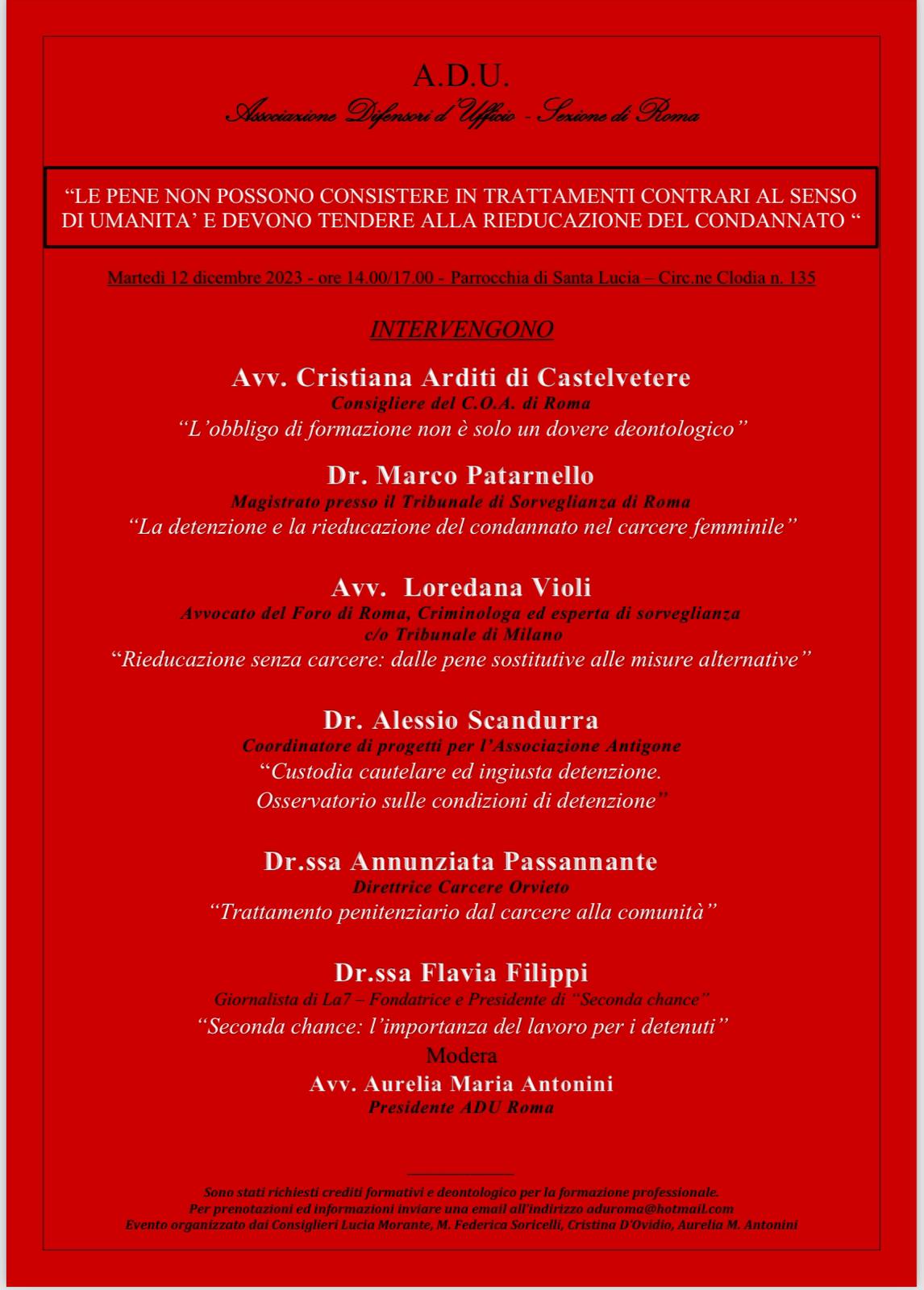 - Relatori : Avv. Cristiana Arditi di Castelvetere (Consigliere del C.O.A. di Roma) “l’obbligo di formazione non è solo un dovere deontologico”; Dr. Marco Patarnello (Magistrato presso il Tribunale di Sorveglianza di Roma), “La detenzione e la rieducazione del condannato nel carcere femminile”; Avv. Loredana Violi (Avvocato del Foro di Roma, Criminologa ed esperta di sorveglianzac/o Tribunale di Milano ), “Rieducazione senza carcere: dalle pene sostitutive alle misure alternative”; Dr. Alessio Scandurra (Coordinatore di progetti per l’Associazione Antigone) “Custodia cautelare ed ingiusta detenzione. Osservatorio sulle condizioni di detenzione”; Dr.ssa Annunziata Passannante (Dirigente UEPE), “Risvolti pratici dell’UEPE finalizzati alla rieducazione del condannato”; Dr.ssa Flavia Filippi (Giornalista di La7 – Fondatrice e Presidente di “Seconda chance”),“Seconda chance: l’importanza del lavoro per i detenuti”. Modera: Avv. Aurelia Maria Antonini (Presidente ADU Roma)